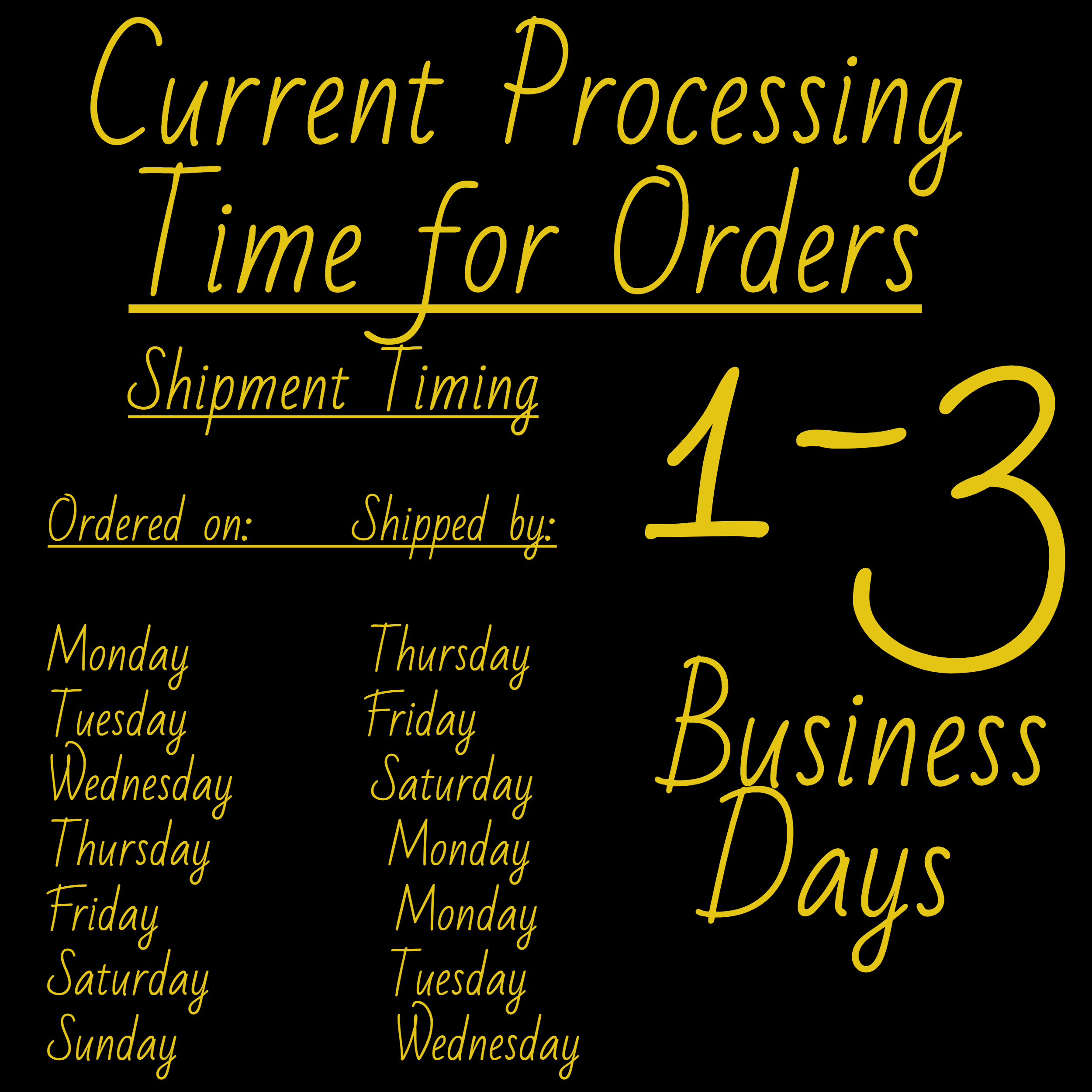 Standard processing is 3-5 business days. NEXT BUSINESS DAY processing available or Order by 11am PST for SAME DAY processing. This DOES NOT affect the shipping speed which you will select at checkout.